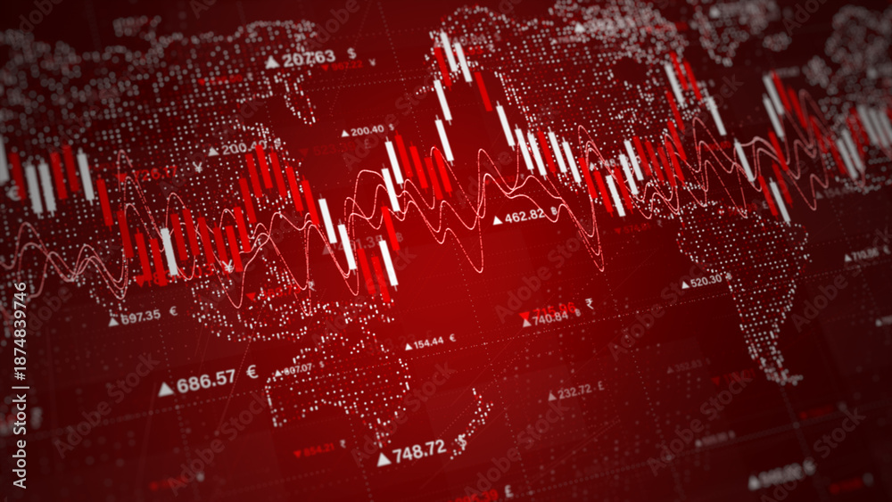 Falling stock graph on a red world map background representing a global financial crash. Ideal for crisis, economics, and trading visuals. finance investment background concept. 3d Rendaring