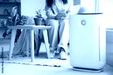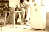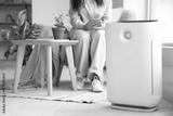 Woman in armchair adjusting air purifier using mobile phone at home