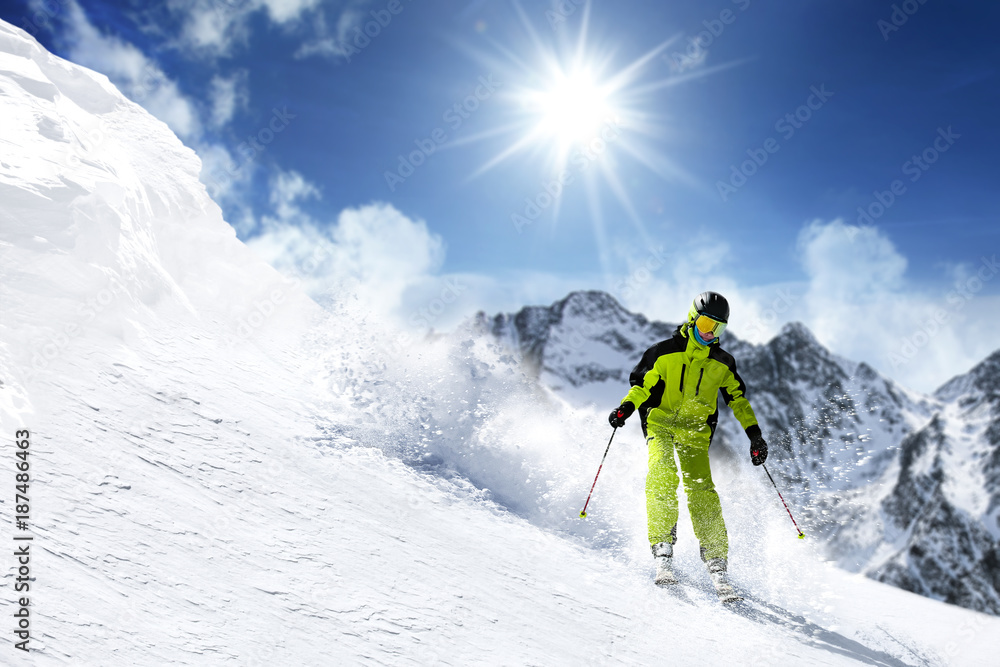 Skier on the top of mountain. A skier sliding down a mountain slope, ski season and great fun in the snow and sunlight in winter time.
