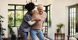 Senior man, nurse and assisted living with help for mobility, physiotherapy or movement in home. Woman, caregiver and lifting elderly person with a disability for helpful nursing in retirement house