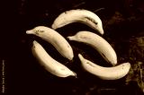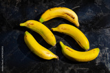 A vibrant bunch of yellow bananas are arranged on a dark, textured surface, with sunlight casting sharp shadows. The photo is a clean, simple, and graphic representation of healthy food.
