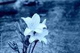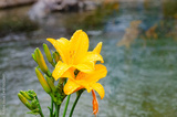 A close-up of bright yellow daylilies covered in raindrops, set against a blurred background of water. The image is a beautiful and serene depiction of nature after rain.
