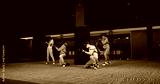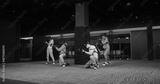 A group of people wearing virtual reality glasses operate a game gun while playing an online video game