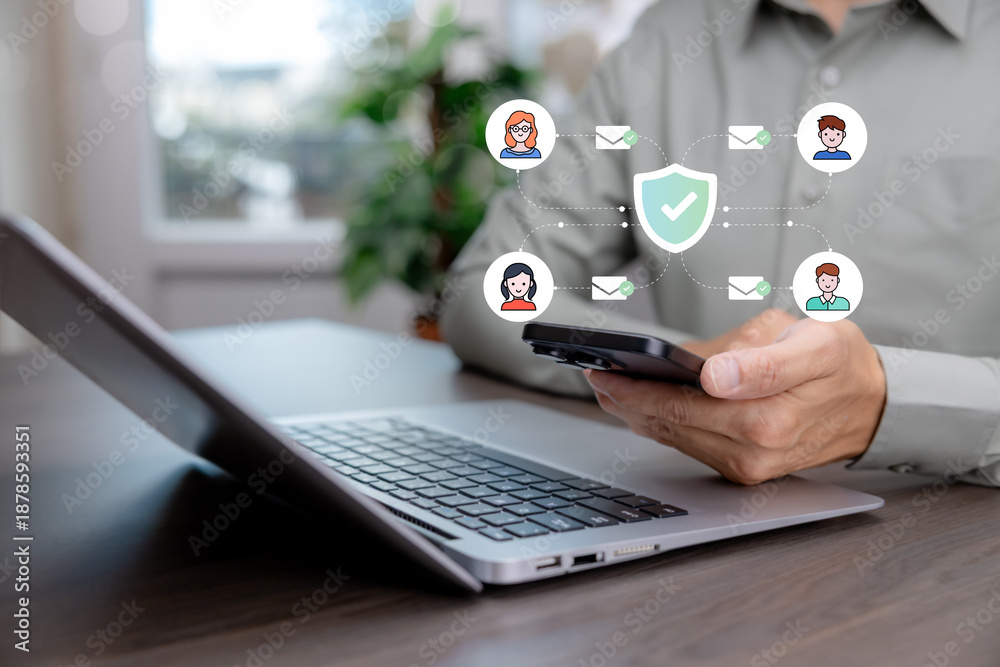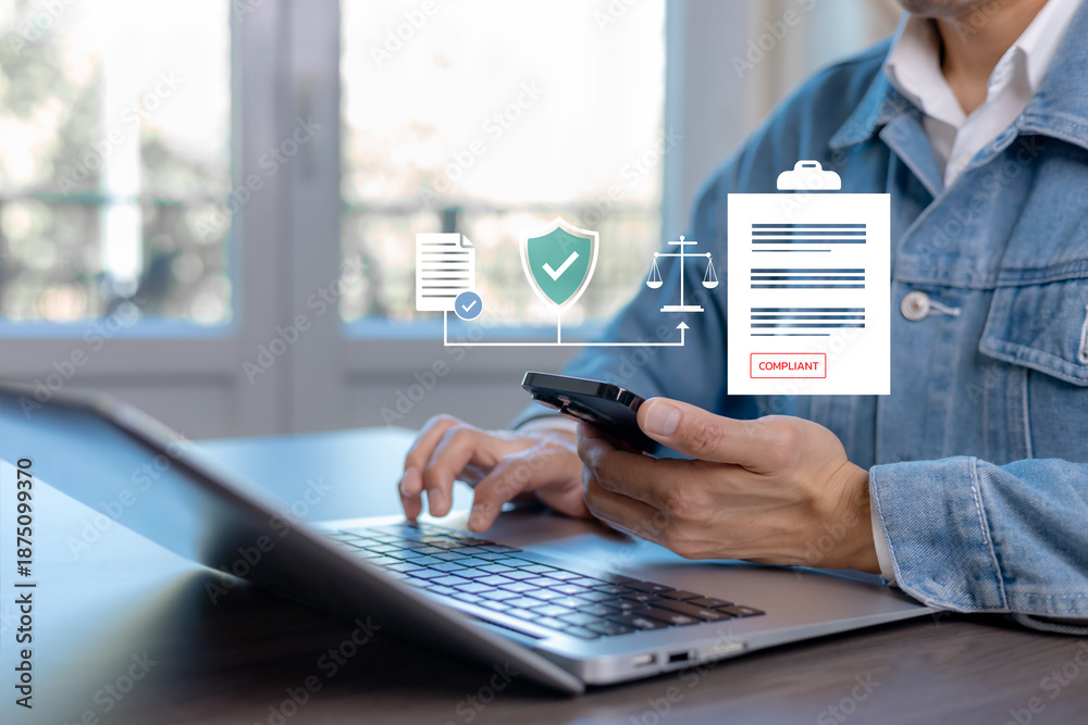 Business compliance and regulatory verification concept. Professional working on laptop and smartphone with digital compliance icons, document approval, legal protection, and governance system.