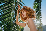 curly woman with natural hair enjoys sunny day outdoors under tropical palm leaves in white sleeveless top, fresh, bright mood, summer vibes
