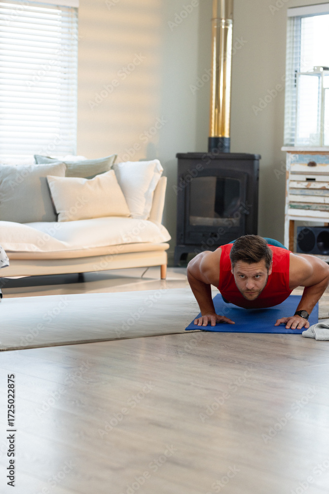 Confident soldier in camo stands at entrance against US flag, embodying patriotism.