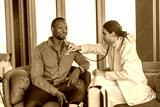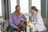 Professional female doctor using stethoscope to listen to african male patient heart, physician examining man chest at hospital clinic, insurance, healthcare, cardiology and medical checkup concept