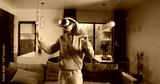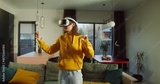 Woman wearing virtual reality glasses playing video game at home