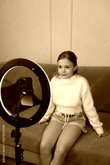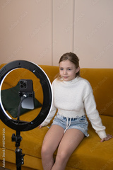 Cheerful young girl wearing a white sweater records video content using a smartphone and ring light while sitting on a yellow sofa, representing creativity and modern digital communication