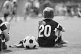 Young Soccer Player Resting During Match. Child Sitting on Grass With Football, Youth Sports Moment Outdoors