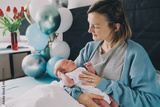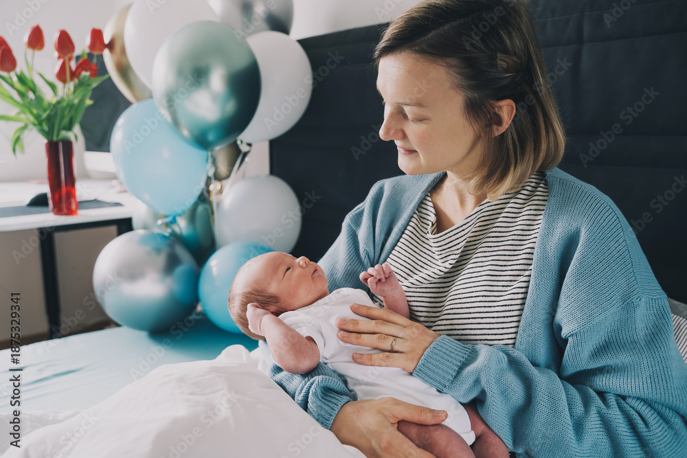 After baby delivery mother and baby at home. Mother holds her newborn in hands. Mom and baby together. Childbirth and motherhood concept. Family celebrates birth of baby boy.