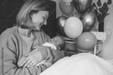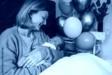 After baby delivery mother and baby at home. Mother holds her newborn in hands. Mom and baby together. Childbirth and motherhood concept. Family celebrates birth of baby boy.