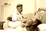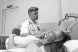 Male Doctor Performing Thyroid Ultrasound on Young Female Patient. Diagnostic Sonography Examination in Modern Clinic. Healthcare Professional Using Ultrasound Probe for Medical Assessment.