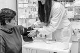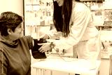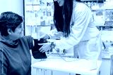 Smiling pharmacist checking blood pressure of a senior woman customer in pharmacy