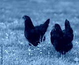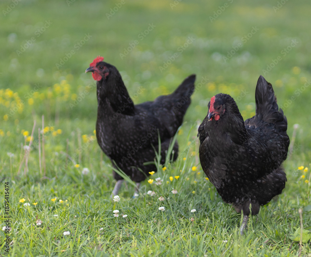 Two auserlorp chicken hens free ranging on a green pasture with flowers