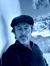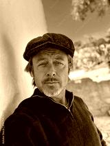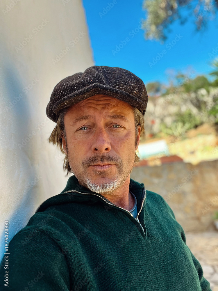 Rugged man with woolen newsboy cap and stubble beard in green woolen sweater standing outside by white wall of spanish house in countryside.