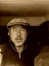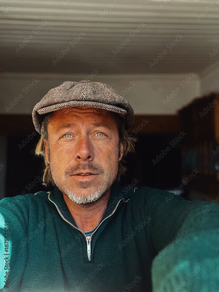 Rugged man with woolen newsboy cap and stubble beard in green woolen sweater in house by window.