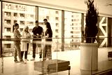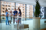 Team of healthcare professionals discussing patient care in a modern hospital setting during the daytime