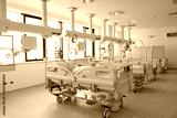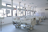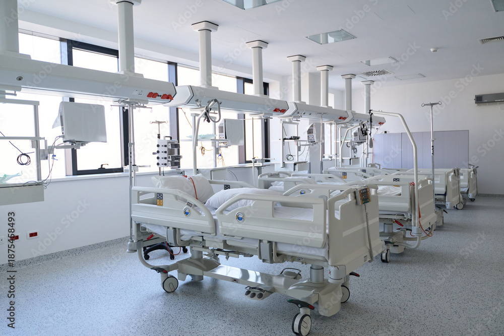 Modern hospital room with multiple patient beds and medical equipment in bright, clean environment