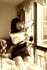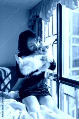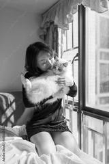 Woman Cuddling Fluffy White Ragdoll Cat by Window in Cozy Urban Apartment Bedroom Morning