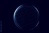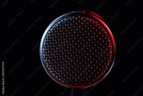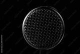 A microphone is centered in the frame against a dark background. Light reflects off its surface, revealing patterns and textures as it stands still.