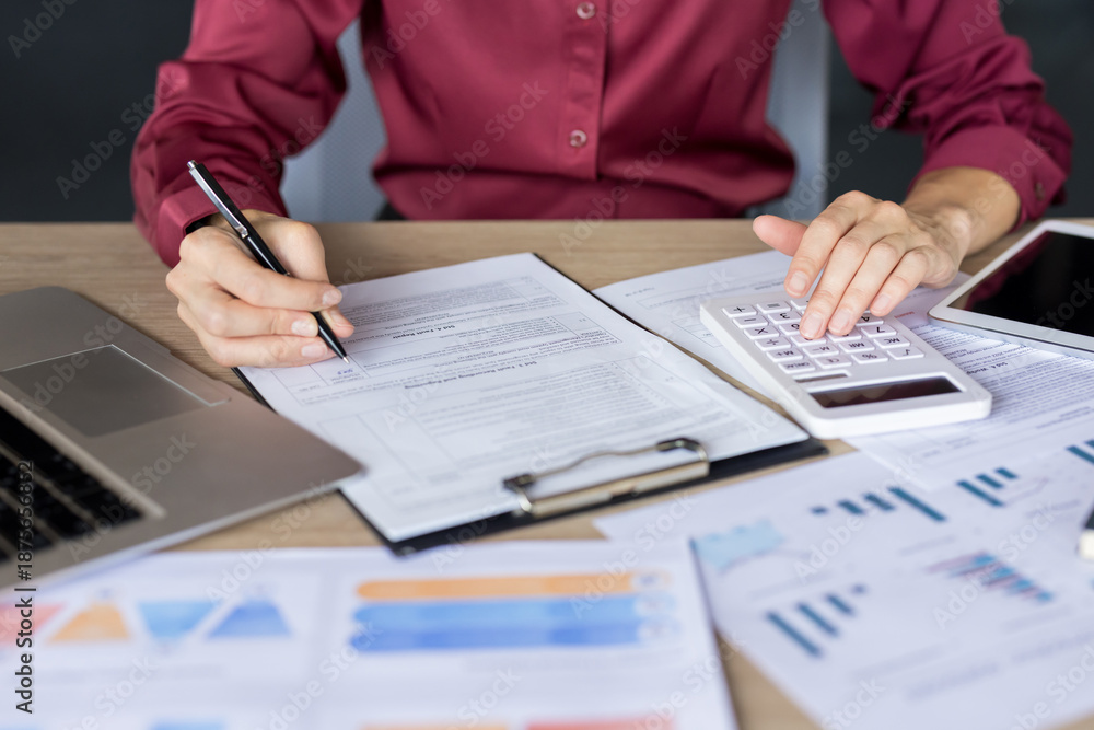 Accountant hands calculating finances and reviewing documents at a cluttered desk with laptop, calculator, charts and ledgers, analyzing budgets, income, expenses and reports