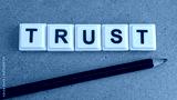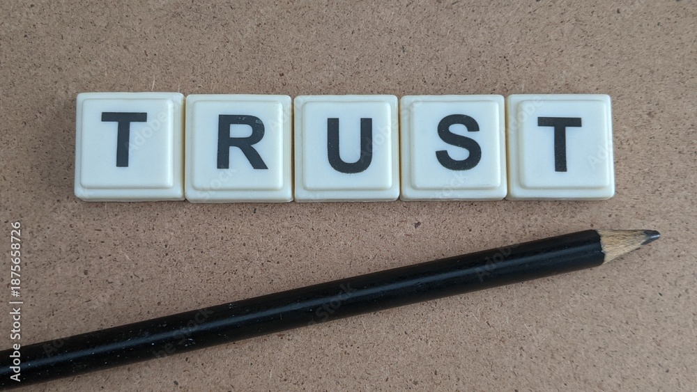 Word TRUST Displayed with Square Tiles and Stationery Element on Neutral Surface for Symbolic Communication