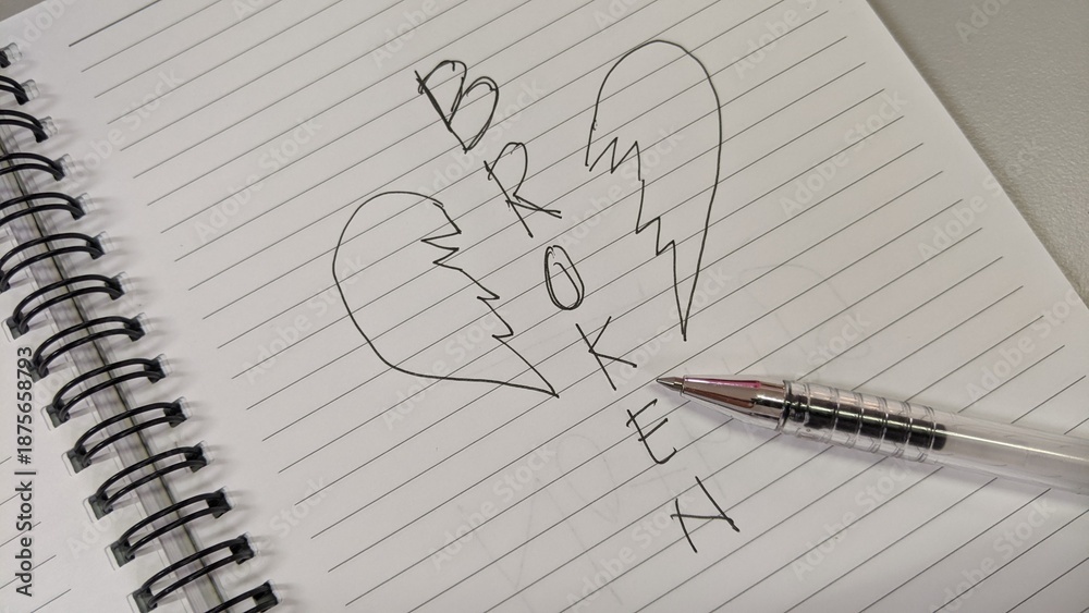Emotive Composition with Broken Heart and Word BROKEN in Spiral Notebook for Themes of Grief and Healing