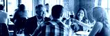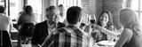 Group of people enjoying a meal at a restaurant, toasting with wine glasses. Diverse group dining, sharing laughter and conversation in a cozy setting. Friends celebrating with wine at restaurant.