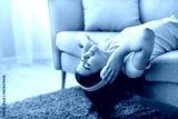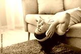 Smiling Indian teen girl in headphones listening to music or audio book, lying on sofa at home, copy space. Happy adolescent relaxing to her favorite song indoors. Quarantine pastimes and hobbies