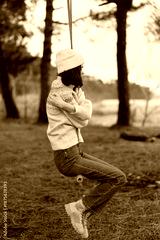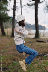 Woman on a swing in a calm outdoor setting, wearing a knit sweater, beanie and jeans, surrounded by tall trees and pine needles, conveying playful winter mood and peaceful nature.