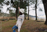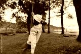 Outdoor scene with a person on a rope swing wearing a knitted sweater and beanie, in a forested lakeside setting. A calm, cozy moment of outdoor winter leisure.