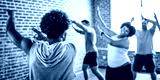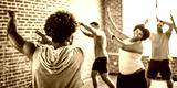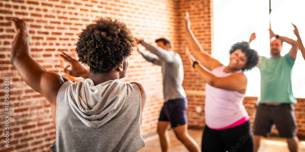 Group dance class with diverse participants in a bright studio. People enjoying dance, following the instructor. Energetic dance session in a lively atmosphere. Diverse people in gym class.