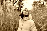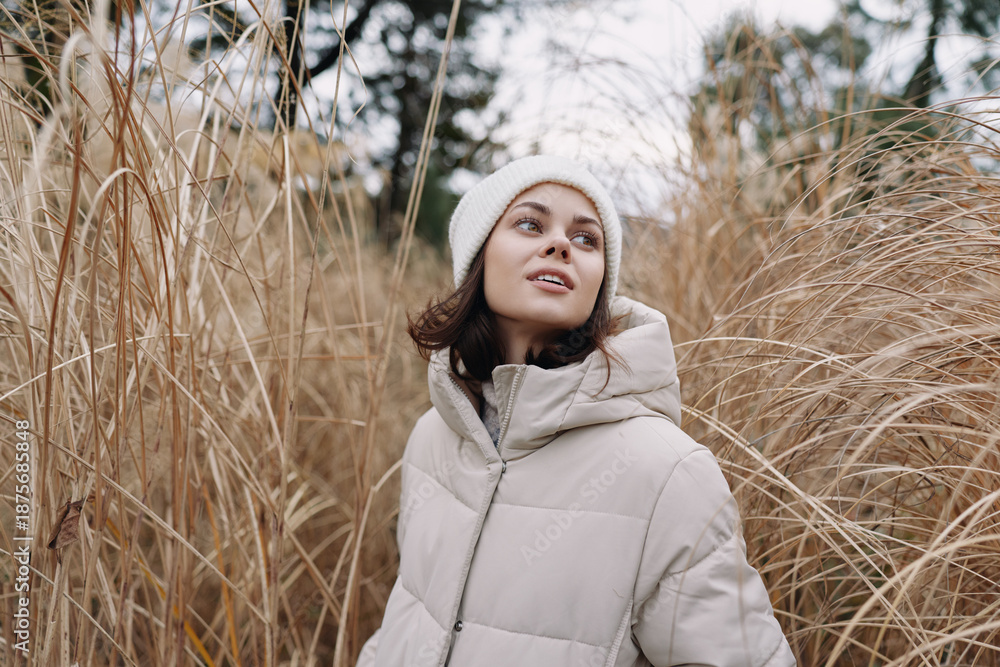 Woman in a light winter coat stands among tall dry grass, looking up with a soft smile in an open field, chilly air and natural light creating a calm seasonal portrait for lifestyle and fashion use.