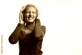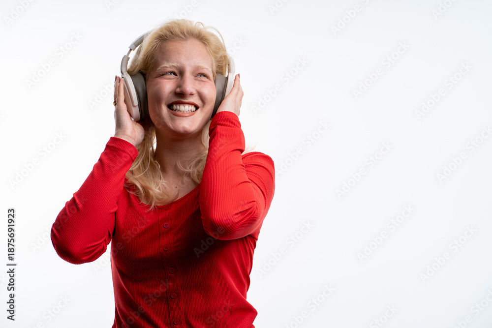 Beautiful woman listening to music using wireless headphones in studio isolated over white background