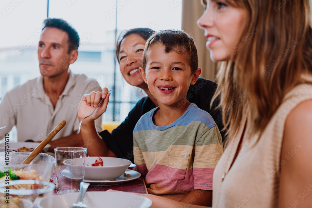 Family and friends reunion at home. Happy multigenerational family enjoying meal together at home