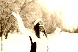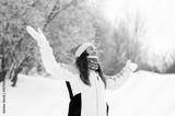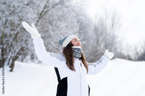 Happy woman enjoying snowfall with raised arms outdoors in winter park