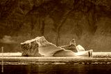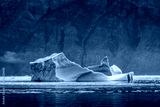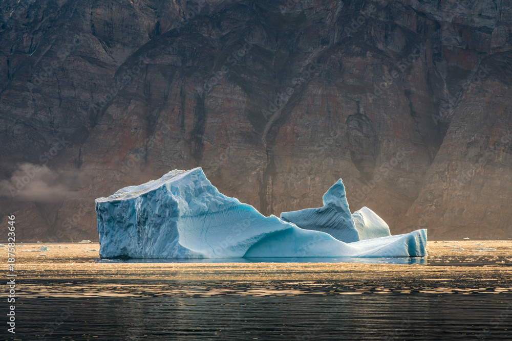 Icebergs lit by the evening sun in the Uummannaq fjord in west Greenland with cliffs of the Salliaruseq island in the background