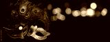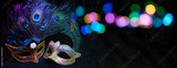 Masquerade masks and peacock feathers with colorful bokeh lights