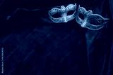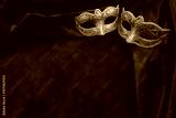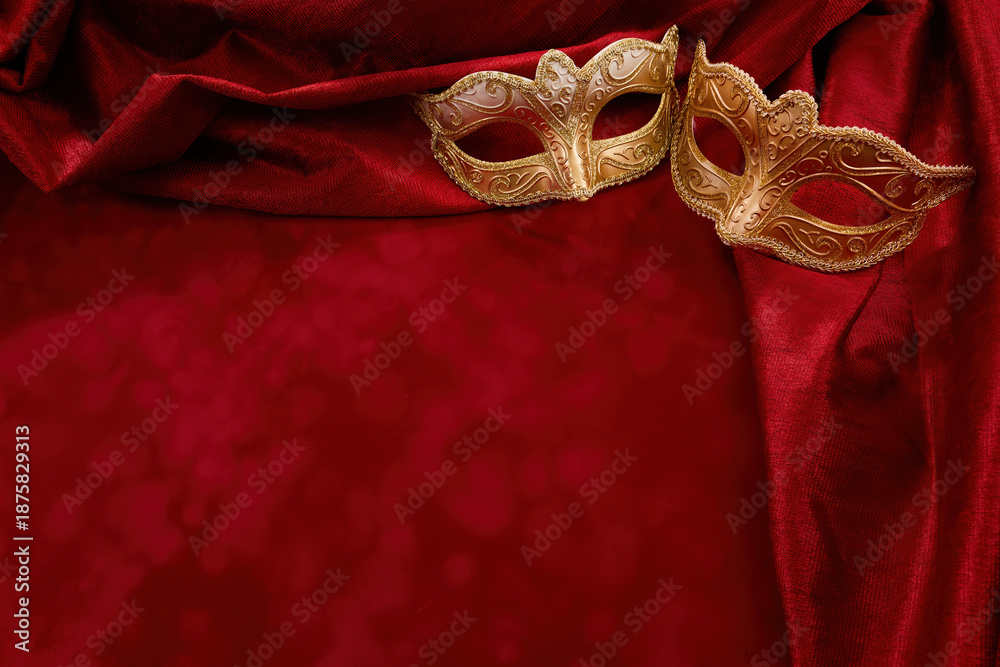 Golden masquerade masks resting on red velvet drapery