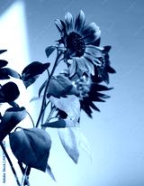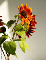 Decorative red, orange Sunflower Flower on beige wall. Minimalist still life. Light and shadow sunlight window aesthetic natural background.