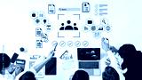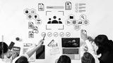A modern office scene showcasing professionals collaborating on data analysis. The image features charts, digital technology, teamwork, and strategic planning elements. Gantry