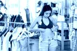 Young woman tries on blue top while shopping in clothing store