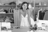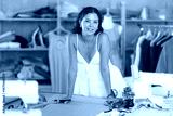 Young fashion designer stands near a table and draws patterns of clothes with the help of curved tailor's rulers.