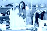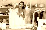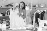 Cheerful young seamstress proudly presenting cream-colored dress with decorative lace details on hanger standing by worktable in creative sewing studio..