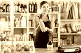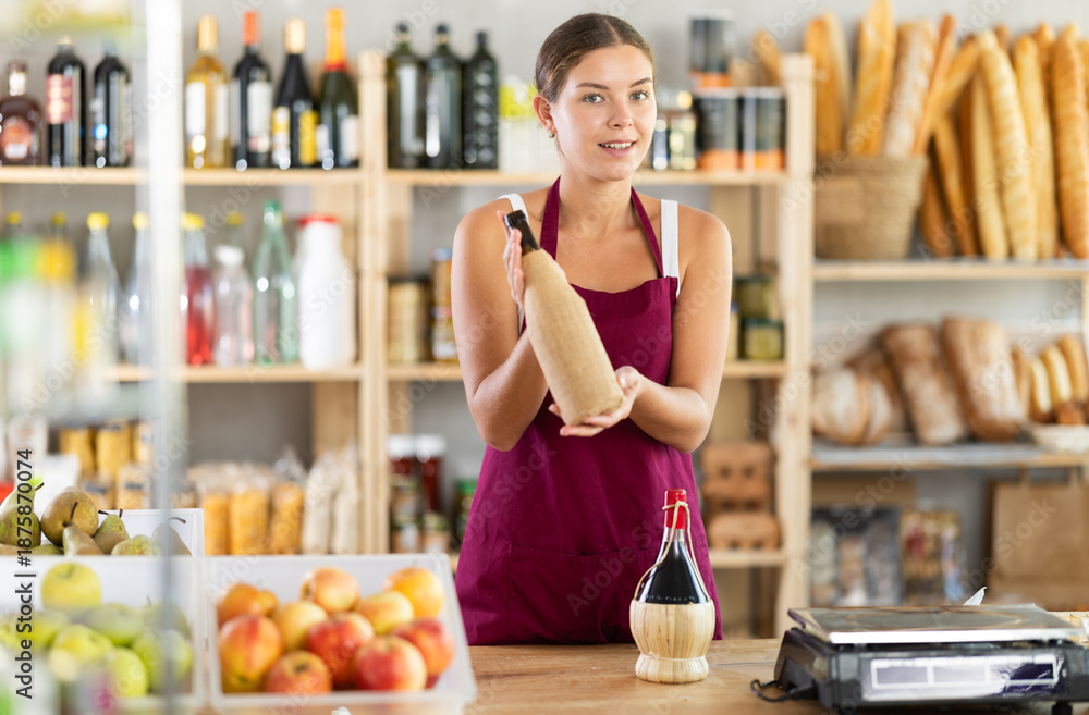 Young saleswoman in uniform offering bottle of wine in grocery store..