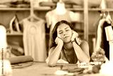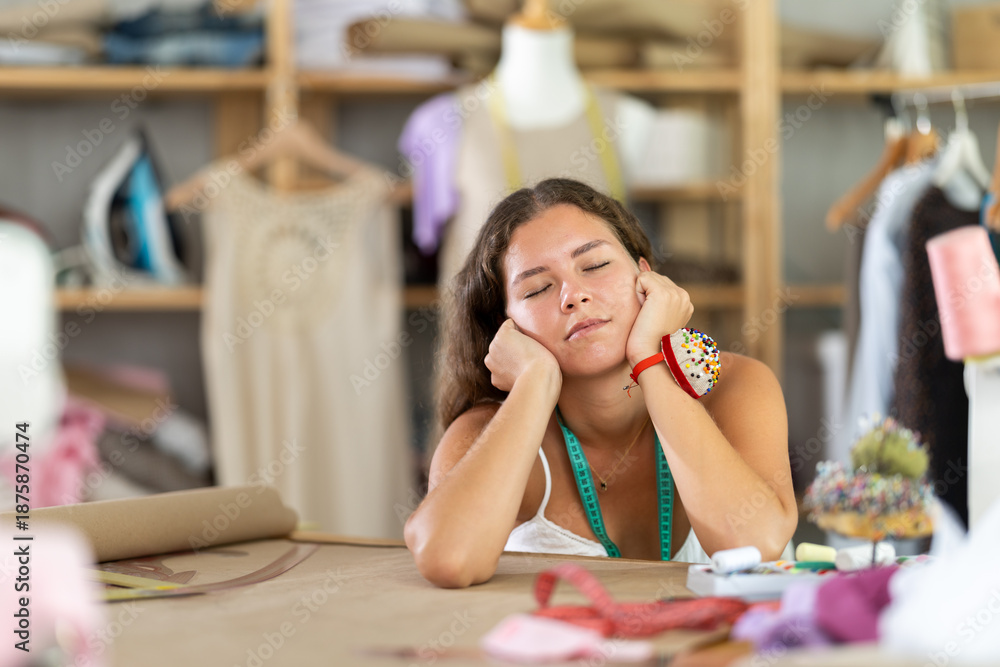 Tired dressmaker woman is sitting at her desk near the sewing machine, she has closed her eyes and falls asleep. Seamstress resting during the working day