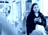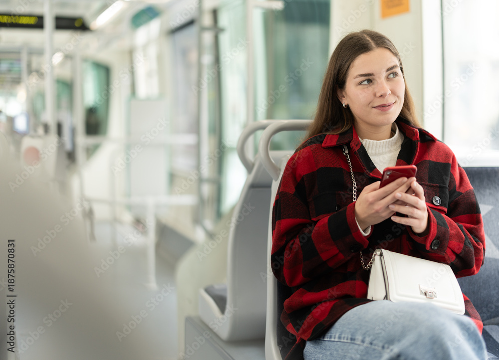 In tramway car, girl sitting with phone and scrolling through news feed, ride to university in tramway carriage, go to work. Public urban electric transport, daily routines of citizen.