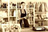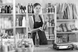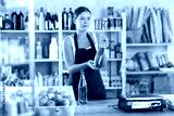 Female salesperson offers to buy a bottle of mineral water in the grocery supermarket