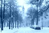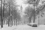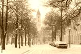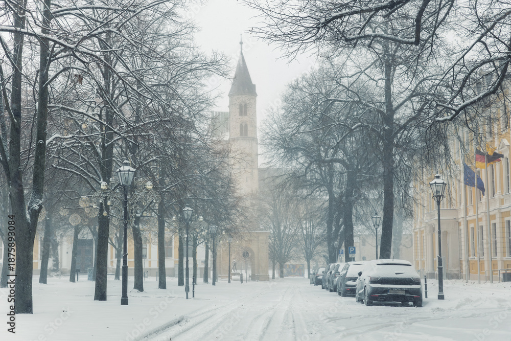 Snow covered Domplatz square Magdeburg leads toward Our Lady Church tower emerging fog snowfall trees historic buildings. Winter silence cold weather urban symmetry calm European city atmosphere